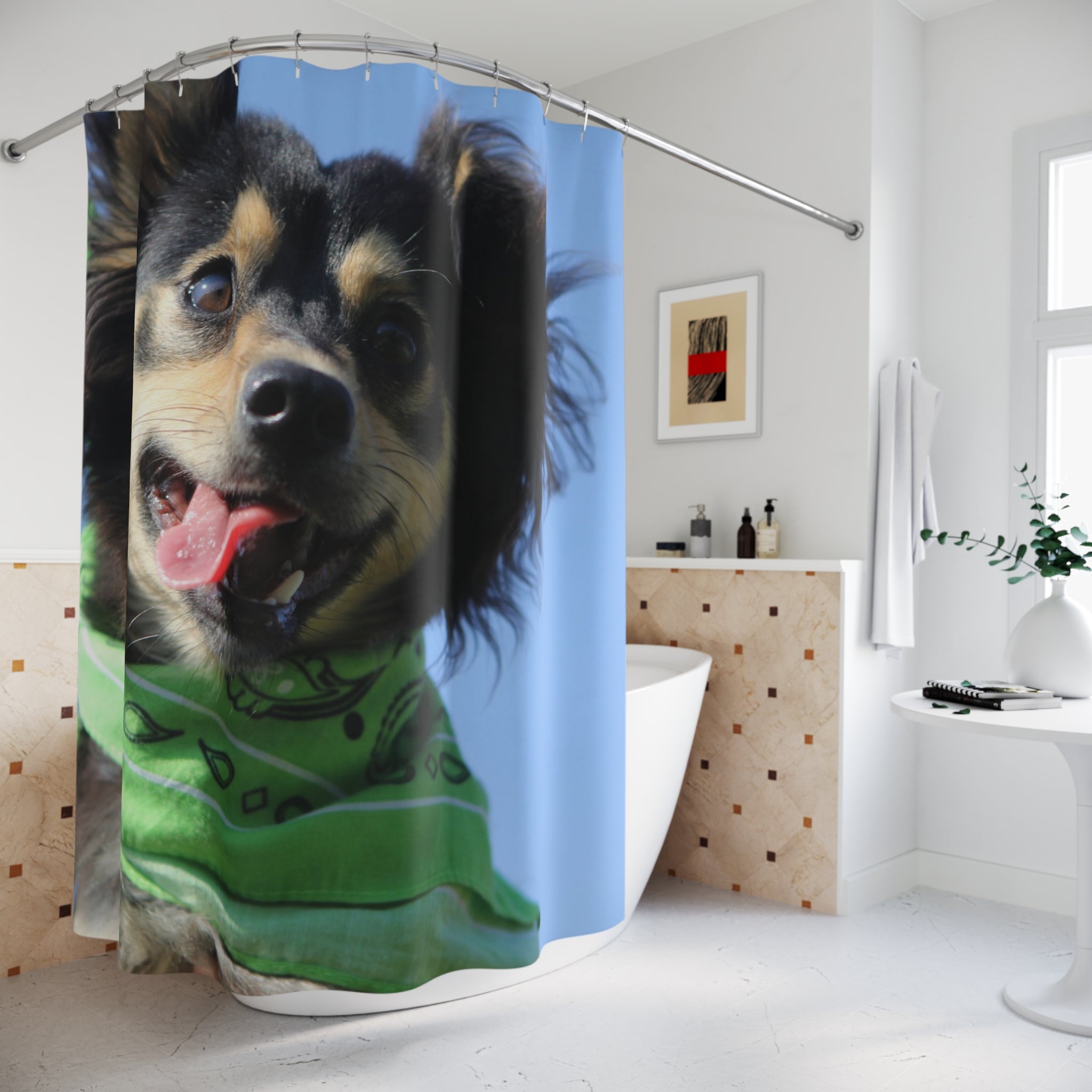 Brighten your mornings and transform your bathroom with an eye-catching shower curtain, printed only once and ony for you with your dog's funniest image!