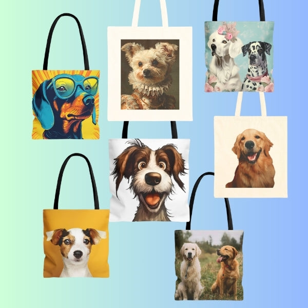 Choose from classic custom photo bags, bold all-over prints, or transformation portraits where your pup becomes the star. If you’d rather skip customization, we’re also launching ready-to-order all-over dog scene designs — perfect for quick gifting or treating yourself.