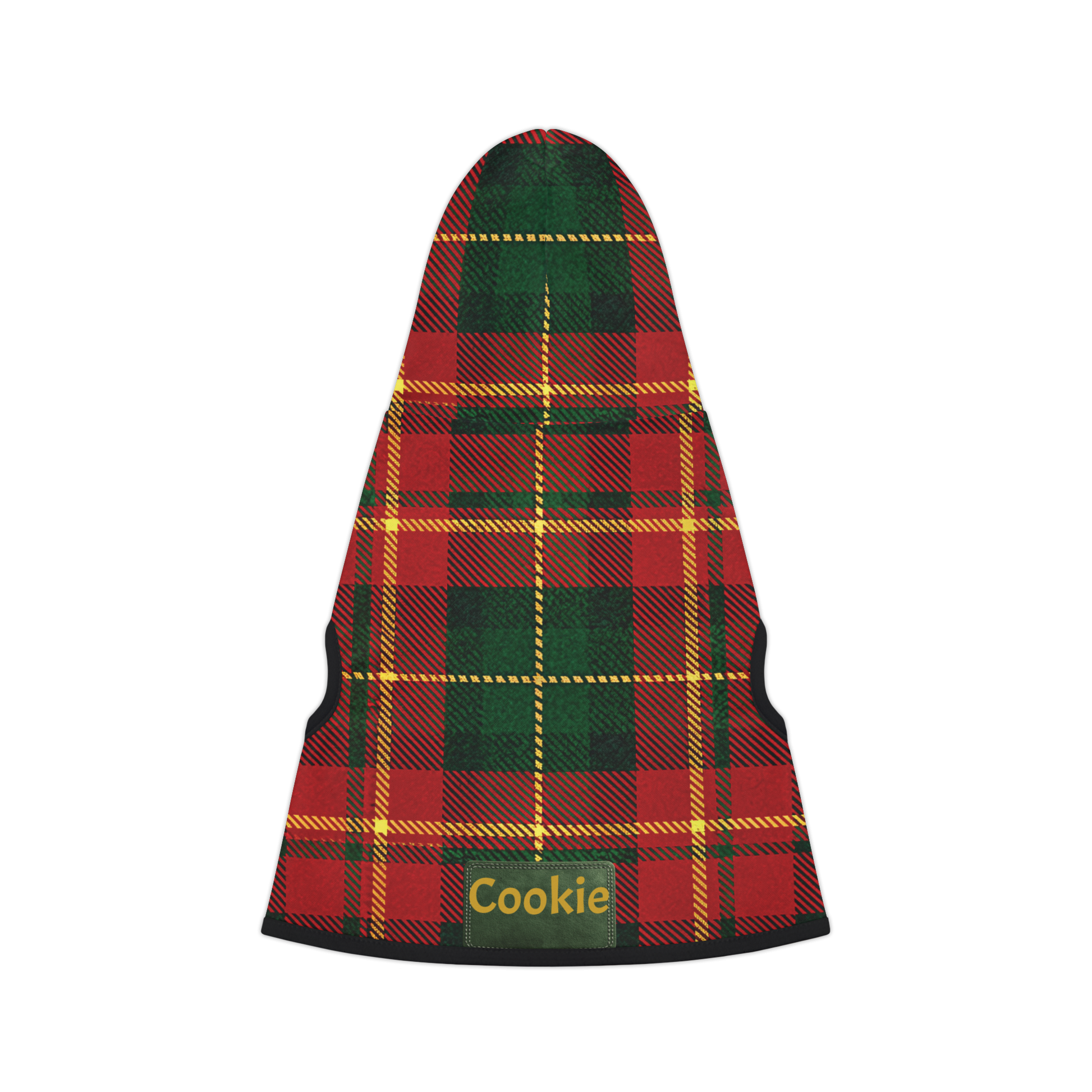 Designed in a classic red-and-green tartan, this cozy hoodie features a back patch that proudly declares your dog’s name.