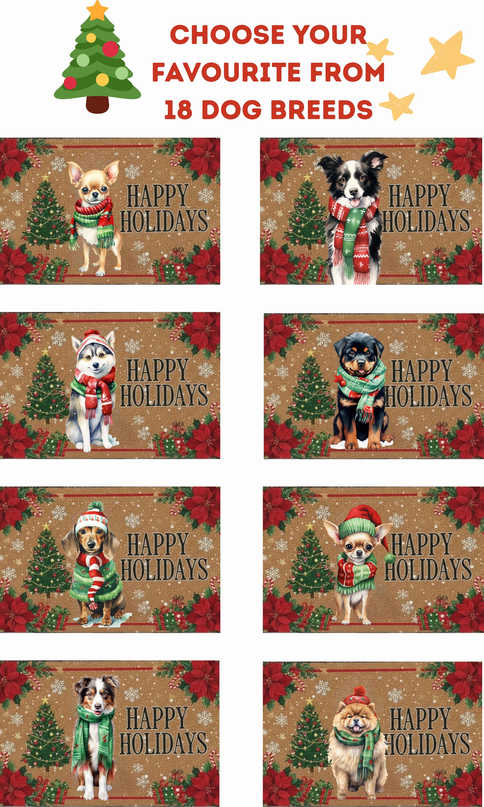 Bring holiday cheer straight to your doorstep with our Personalized Holiday Dog Breed Doormat. Featuring your favorite dog breed in a cozy Christmas scarf, paired with festive holiday designs like poinsettias, candy canes, and a sparkling Christmas tree, this mat makes every guest feel the warmth of the season.