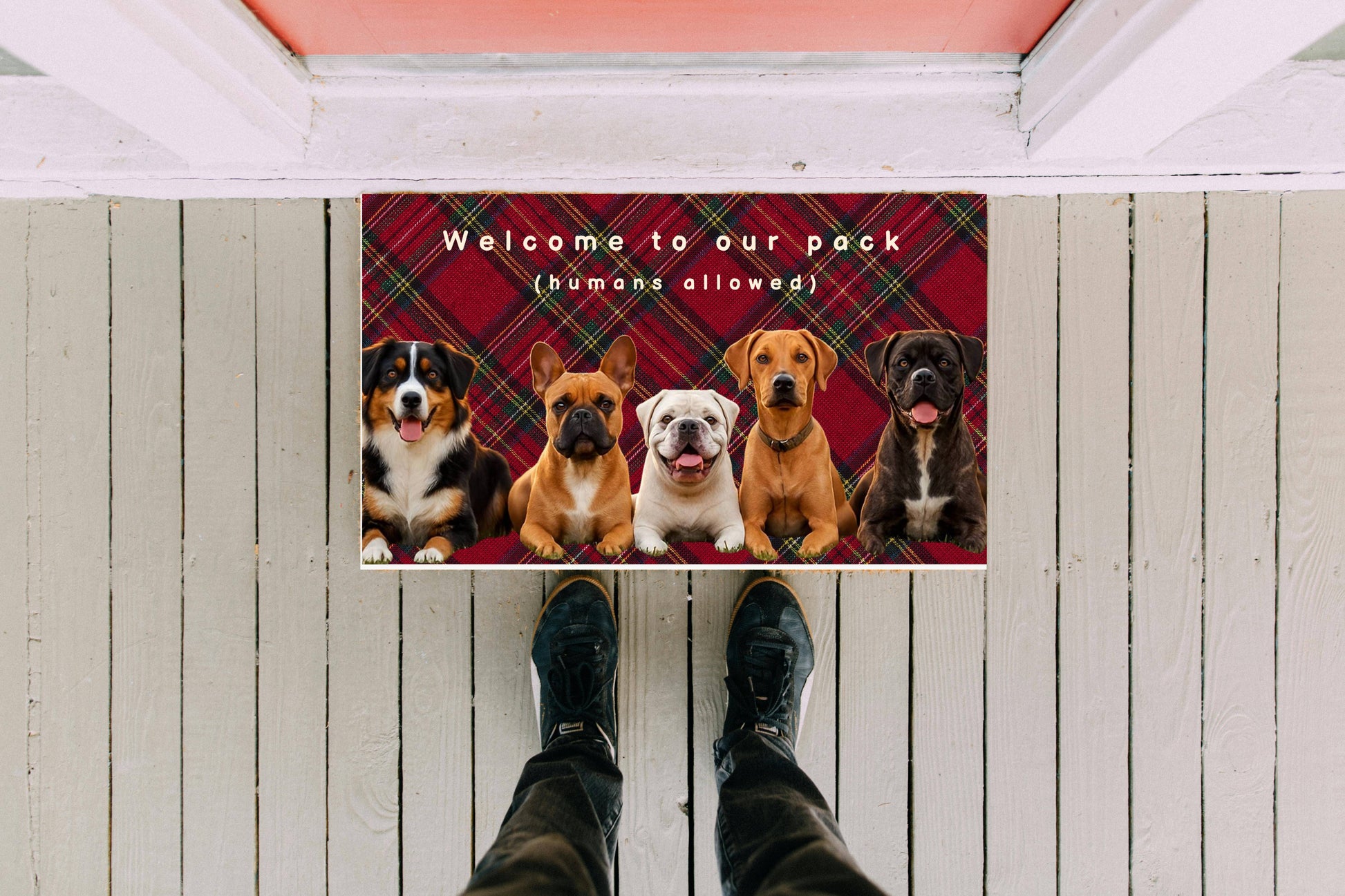Make your entryway unforgettable with this “Welcome to Our Pack (Humans Allowed)” custom dog doormat — the perfect mix of humor, charm, and function. Whether you’re a multi-dog household or simply want to show off your pack pride, this mat sets the tone before guests even step inside.